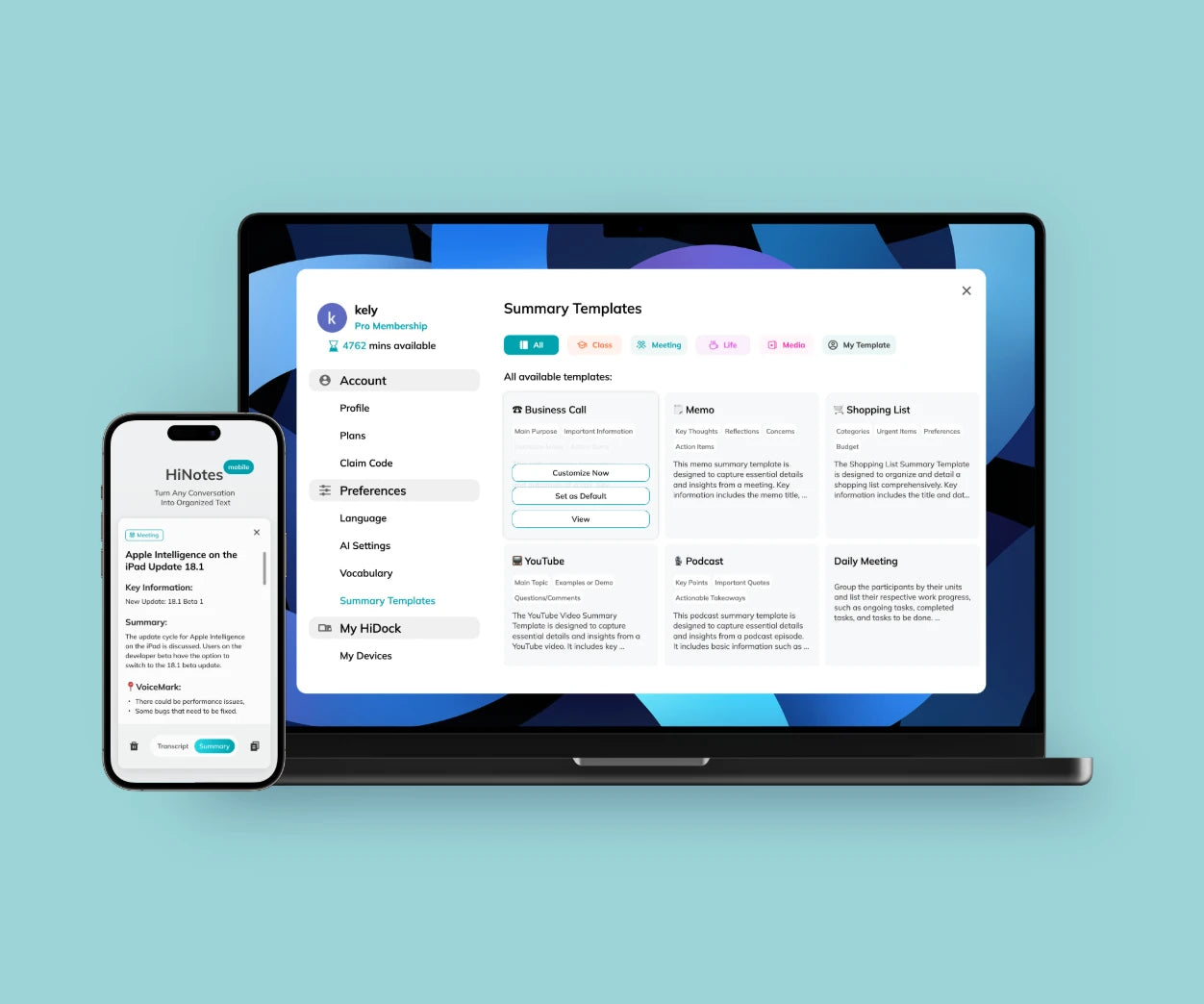 AIは単なるノイズキャンセリングのために使用されているわけではありません。文字起こし、要約を通じて生産性を向上させる最先端機能「HiNotes」を積極的に開発しています。AIによるコミュニケーションと生産性の向上をHiDockでお楽しみください。